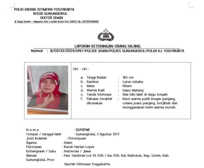 GUNUNGKIDUL, DIY (FAKTA9.COM)_ _// Seorang wanita paruh baya warga Padukuhan Tambaran Lor, Kalitekuk, Semin, bernama Suyatmi dikabarkan hilang oleh keluarganya sejak Minggu (03/11/2024) sekitar pukul 06.30 WIB.