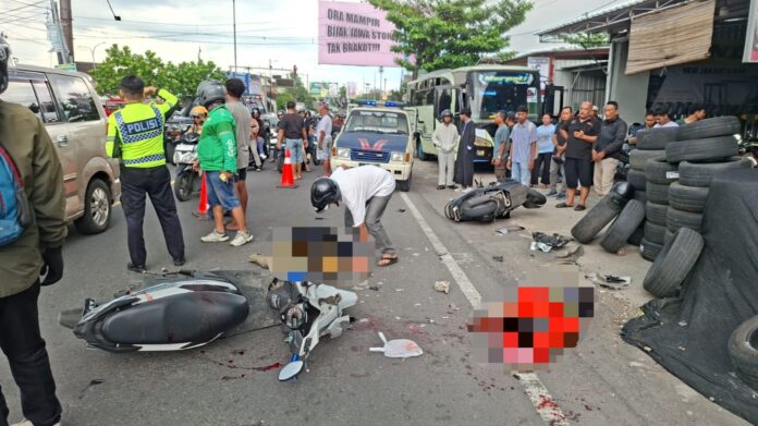 BANTUL, DIY (FAKTA9.COM)_ _// Tabrakan adu banteng antara sepeda motor Honda Beat nomor polisi AB 4071 OK kontra Honda Scoopy nomor polisi AB 4520 YV terjadi di Jalan Wonosari tepatnya depan Jakarta Ban Padukuhan Tegalsari, Jomblangan, Banguntapan, Bantul, pada Minggu (08/03/2026) pukul 12.55 WIB.