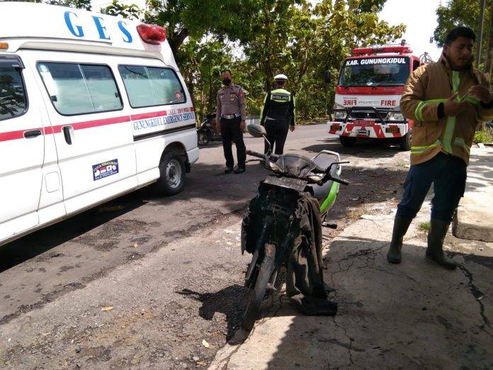 “Tadi kita lakukan evakuasi terhadap sepeda motor yang terbakar di jalan Ring Road Selatan, Wukirsari, Baleharjo, Wonosari, Gunungkidul, Minggu (09/10/2022) sekitar pukul 09.00 WIB.” jelas Kepala UPT Pemadam Kebakaran Gunungkidul, Handoko.