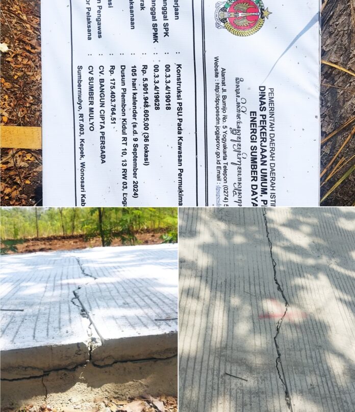 GUNUNGKIDUL, DIY (FAKTA9.COM)__// Belum genap sebulan, jalan rabat beton bantuan Konstruksi Sarana, dan Utilitas Umum (PSU) pada kawasan pemukiman dari Dinas Pekerjaan Umum, Perumahan, Dan Energi Sumber Daya Mineral (DPUPESDM) di wilayah Padukuhan Plembon Kidul, Kalurahan Logandeng, Playen, Gunungkidul sudah mengalami kerusakan cukup parah.