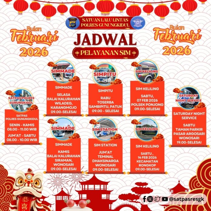 GUNUNGKIDUL, DIY (FAKTA9.COM)_ _// Satuan Lalu Lintas (Satlantas) Polres Gunungkidul menjadwalkan pelayanan Surat Izin Mengemudi (SIM) Keliling yang akan disebar dibeberapa wilayah Kabupaten Gunungkidul pada Bulan Februari 2026 ini.