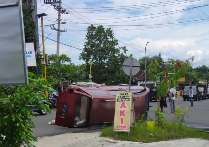Akibatnya, kendaraan Daihatsu Espas oleng hingga terguling di badan jalan.