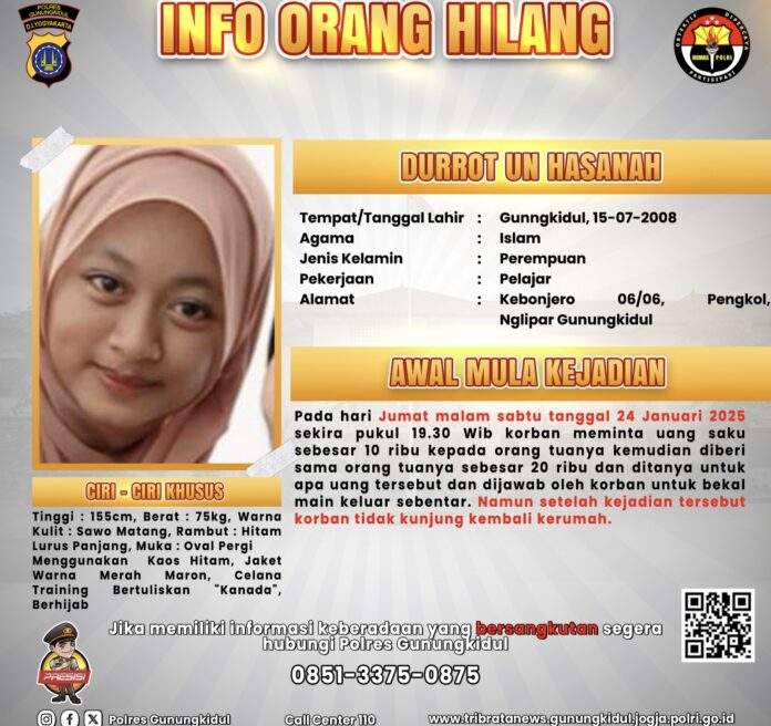 GUNUNGKIDUL, DIY (FAKTA9.COM)_ _// Seorang gadis cantik warga Padukuhan Kebonjero, Pengkol, Nglipar, Gunungkidul, bernama Durrot Un Hasanah dikabarkan pergi meninggalkan rumah tanpa pamit sejak Jum’ at (24/01/2025) sekitar pukul 19.30 WIB.