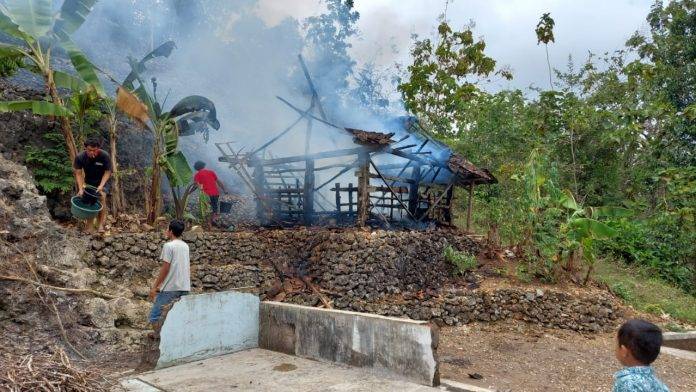 PURWOSARI (Fakta9.com)_ _// Sebuah bangunan kandang kambing milik Joyo Sutrisno (80) warga Padukuhan Tlasih RT 02 RW 02, Kalurahan Giriasih, Kapanewon Purwonsari, Kabupaten Gunungkidul, hangus dilalap jago merah.