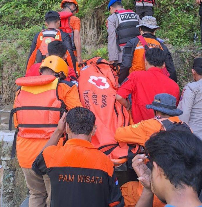 “Kami bersama Basarnas dan para relawan langsung melakukan penyisiran untuk mencari keberadaan korban, hingga akhirnya sekitar pukul 14.30 korban ditemukan dengan kondisi sudah tidak bernyawa dengan jarak 30 meter dari lokasi kejadian.” Ungkap Kapolsek.