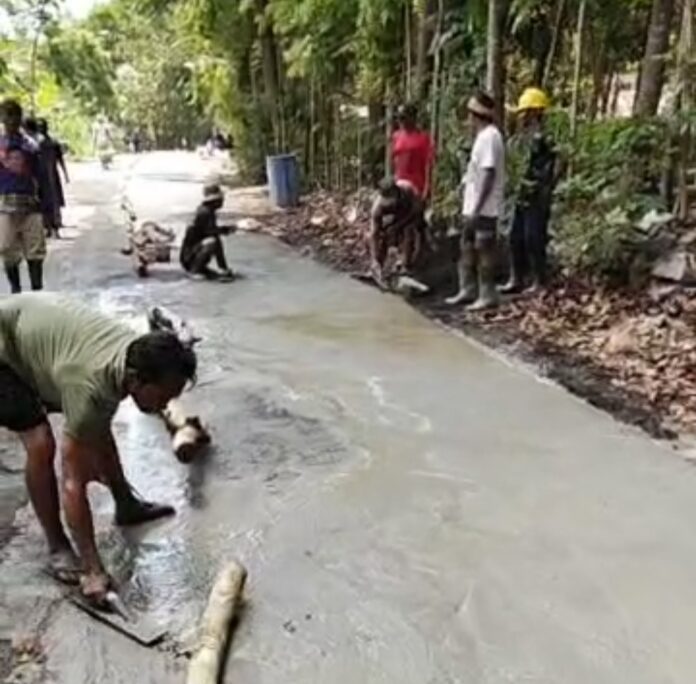 GUNUNGKIDUL, DIY (FAKTA9.COM)__//Prihatin dengan jalan aspal rusak dan sangat membahayakan pengendara sepeda motor yang melintas, warga Kalurahan Getas, Playen, Gunungkidul melakukan pengecoran.