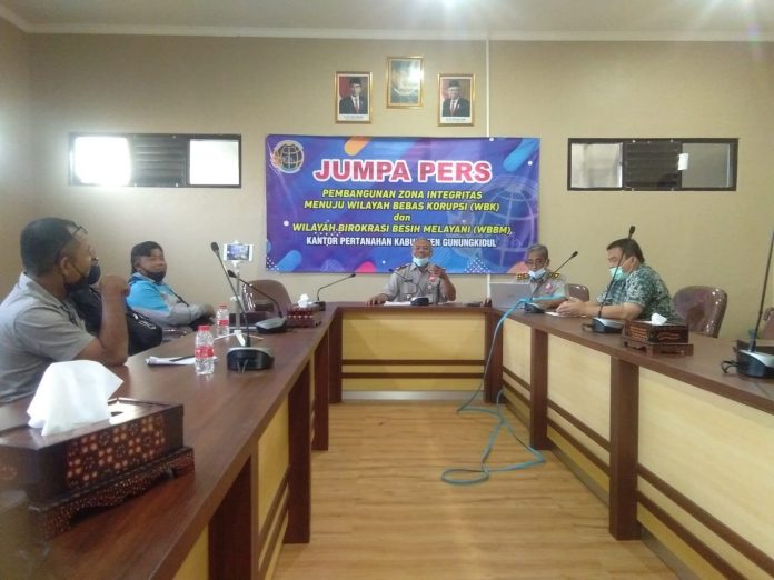 Wonosari, (fakta9.com)__ Kantor Agraria dan Tata Ruang/Badan Pertanahan Nasional (ATR/BPN) Kabupaten Gunungkidul sosialisasikan program pembangunan zona integritas wilayah bebas korupsi dan wilayah birokrasi bersih melayani tentang pertanahan, Kamis(18/11/2021).