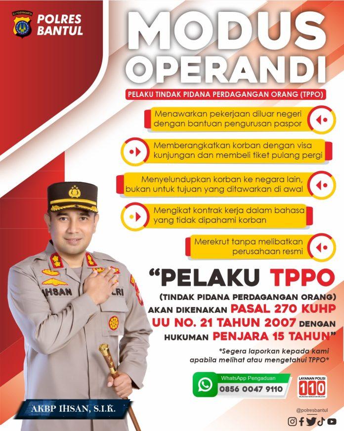 BANTUL, (Fakta9.com)__//Kapolres Bantul, D.I Yogyakarta Ajun Komisaris Besar Polisi (AKBP) Ihsan mengimbau masyarakat mewaspadai modus kejahatan tindak pidana perdagangan orang (TPPO) guna menghindari hal-hal yang tidak diinginkan.