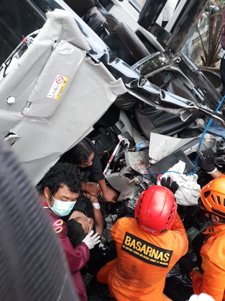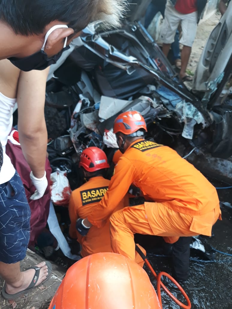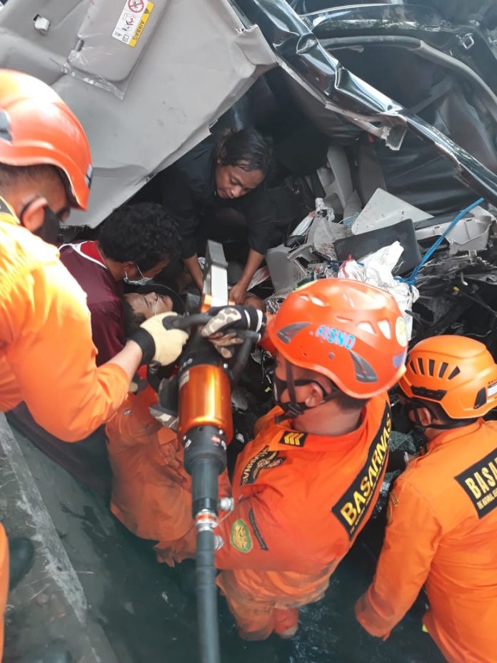 Kerasnya benturan dalam kecelakaan tersebut, mengakibatkan seluruh body mobil ringsek, sehingga pengemudi terjepit body kendaraan.