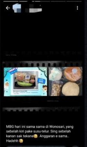 Dalam foto yang diunggah di SW diberi narasi, “MBG hari ini sama-sama di Wonosari, yang sebelah kiri pakai susu-telur, yang sebelah kanan sak tekane (seadanya), Anggarane sama,, hadewh…”