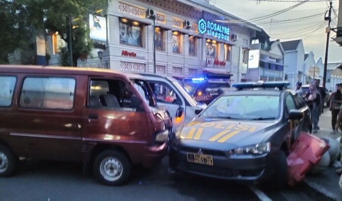 YOGYAKARTA, DIY (FAKTA9.COM)__// -Tabrakan beruntun melinatkan 3 unit kendaraan roda empat salah satunya mobil patroli Polisi terjadi di simpang empat Terangbulan, Danurejan, Kota Yogyakarta, Rabu (05/03/2025) sekitar pukul 05.30 WIB.