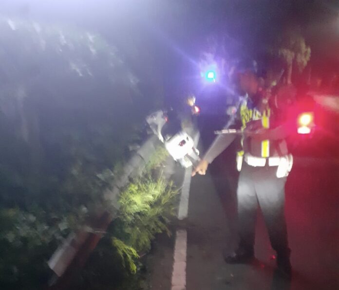 Sesampainya di tempat kejadian perkara, diduga pengendara kurang konsentrasi sehingga menabrak pembatas jalan dan terjatuh di aspal jalan.