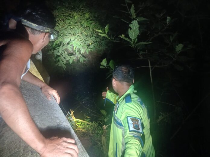 Setibanya di tempat kejadian perkara, posisi jalan menikung ke kanan dan ke kiri kondisi jalan gelap, pemotor tiba-tiba menabrak pangkal pengaman jembatan dan terjatuh ke sungai sedalam 4 meter dengan ketinggian air 1 meter.