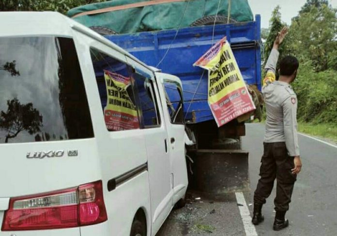 Karena jarak yang terlalu dekat, pengemudi Daihatsu Luxio tak mampu mengendalikan laju kendaraanya, sehingga menabrak truk tronton yang sedang terparkir itu dari bagian nelakang.