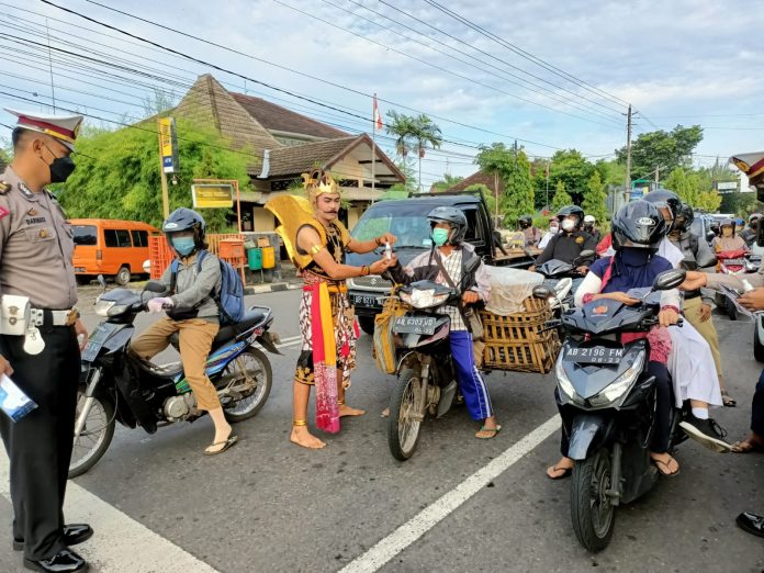 WONOSARI (fakta9.com)_ _// Oprasi keselamatan Progo 2022 yang dilaksanakan Jajaran Polres Gunungkidul dimeriahkan oleh tokoh pewayangan Gatot Kaca. Selasa (08/03/2022).