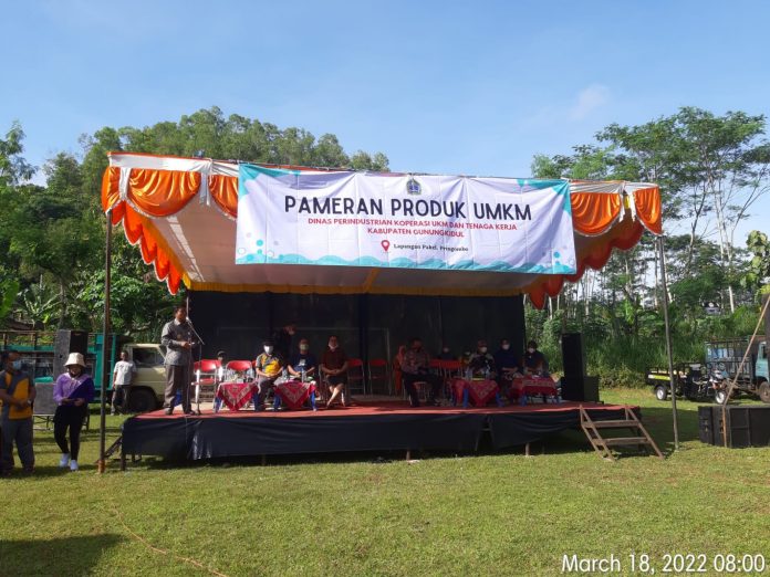 RONGKOP (fakta9.com)_ _// Pemerintah Kalurahan Pringombo bekerjasama dengan Dinas Perindustrian, Koperasi, Usaha Kecil dan Menengah, dan Tenaga Kerja Kabupaten Gunungkidul menggelar pameran yang menyajikan produk lokal di Padukuhan pakel, Kalurahan Pringombo, Kapanewon Rongkop pada hari Jum’at (18/03/2022).