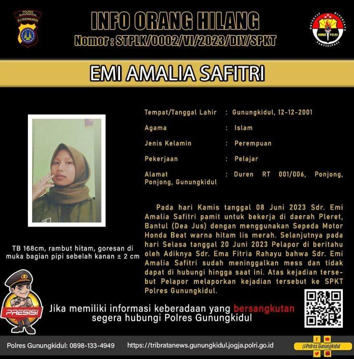 Gunungkidul (Fakta9.com)_ _// Emi Amalia Safitri, gadis cantik warga Padukuhan Duren RT 001 RW 006, Kalurahan Ponjong, Ponjong, Gunungkidul, dilaporkan hilang oleh pihak keluarga.