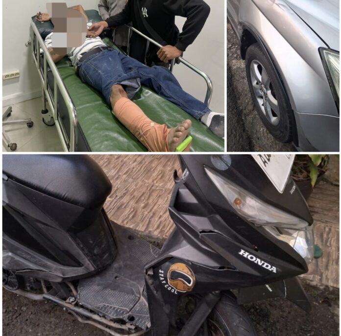 Akibat kejadian tersebut, pemotor terkapar di jalan dan mengalami memar di dada bagian bawah serta patah kaki kanan.