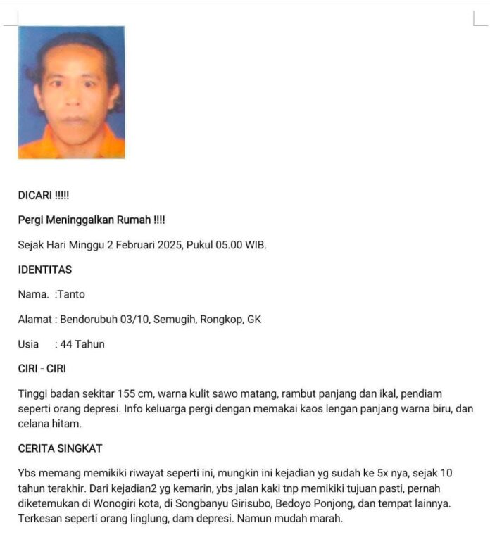 GUNUNGKIDUL, DIY (FAKTA9.COM)_ _// Seorang pria bernama Tanto (44) warga Padukuhan Bendorubuh, Semugih, Rongkop, dikabarkan hilang pergi meninggalkan rumah sejak Minggu (02/02/2025) pukul 05.00 WIB.