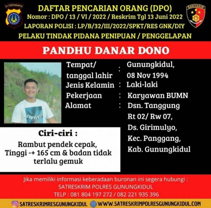 GUNUNGKIDUL (Fakta9.com)_ _// Polres Gunungkidul menetapkan seorang pemuda yang berstatus karyawan BUMN sebagai Daftar Pencarian Orang (DPO) tindak pidana kasus penipuan dan penggelapan.