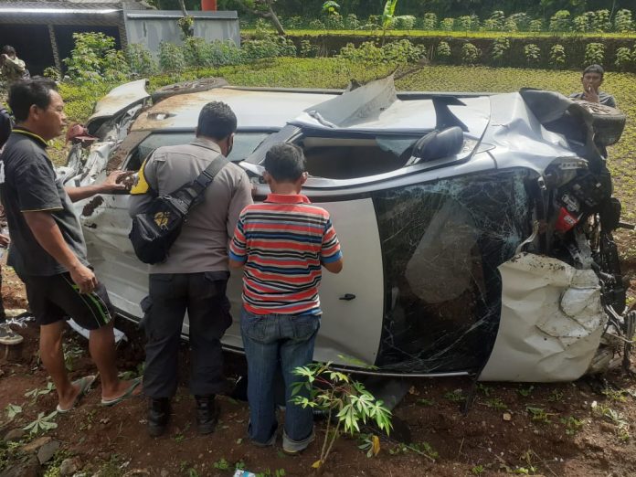 Akibatnya mobil tersebut sempat menabrak sebuah pohon yang ada di seberang jalan hingga terbalik dan masuk ke ladang milik warga.