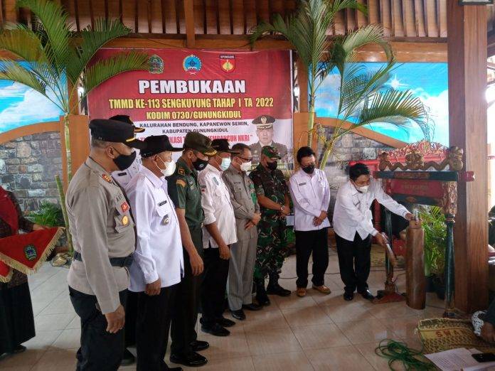 SEMIN, (Fakta9.com)__//Wakil Bupati Gunungkidul, Heri Susanto, S.Kom membuka secara resmi program TNI Manunggal Masuk Desa (TMMD) tahap I tahun 2022 di Kalurahan Bendung, Kalurahan Semin, Rabu (11/05/2022).
