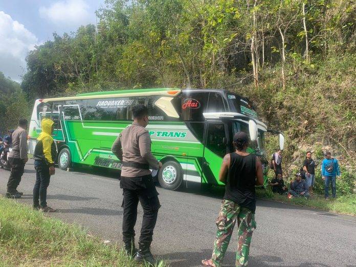 SAPTOSARI (Fakta9.com)_ _// Kecelakaan antara Bus Pariwisata nopol AD 6018 OE dengan sepeda motor jenis Honda Scoopy nopol H 4438 BIG terjadi di ruas Jalan Jalur Lintas Selatan (JJLS) Tanjungsari-Saptosari tepatnya di Padukuhan Karang, Kalurahan Planjan, Kapanewon Saptosari, Kabupaten Gunungkidul, Minggu (18/09/2022) pukul 15.00 WIB.