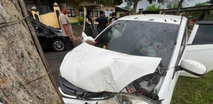 “Mobil baru berhenti setelah menabrak pohon angsana di depan Mapolsek Tanjungsari.” Ucapnya.