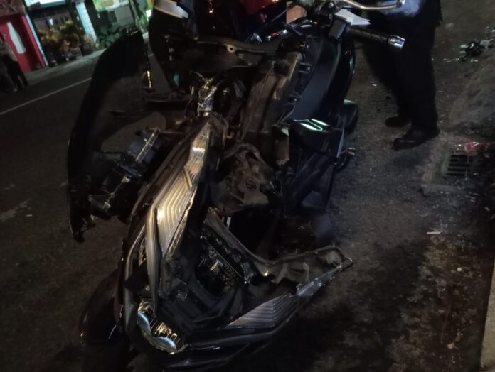 Kerasnya benturan itu menyebabkan pemotor mengalami cidera kepala ringan dan luka pada kaki kanan.