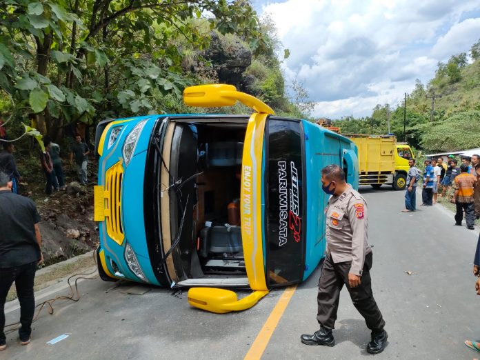 PONJONG ( fakta9.com )_ _// Kembali terjadi, sebuah Bus Pariwisata nopol G 7002 OJ yang membawa rombongan dari Kabupaten Kulonprogo terguling di jalan umum Semanu – Bedoyo atau tanjakan Pocucak tepatnya Padukuhan Asemlulang, Kalurahan Sidorejo, Kapanewon Ponjong, Kabupaten Gunungkidul, pada hari Sabtu (08/01/2022).