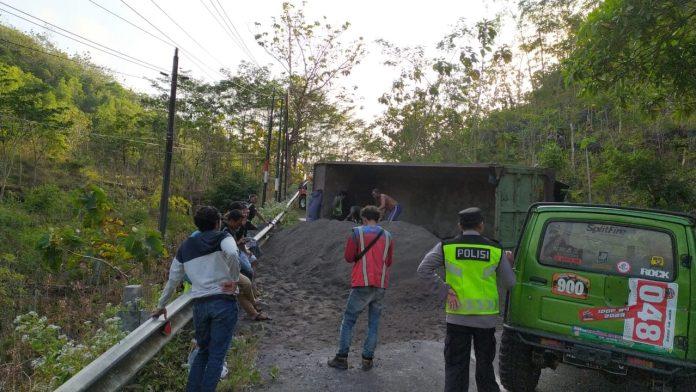 Tepus (Fakta9.com)_ _// Arus lalu lintas Jalan Tepus – Girisubo sempat terhambat lantaran adanya Truk Dump merk Hino 500 warna Hijau nomor polisi AB 9195 LB milik PT. Surya Karya Setiabudi (SKS) yang mengangkut material pasir terguling di jalan.