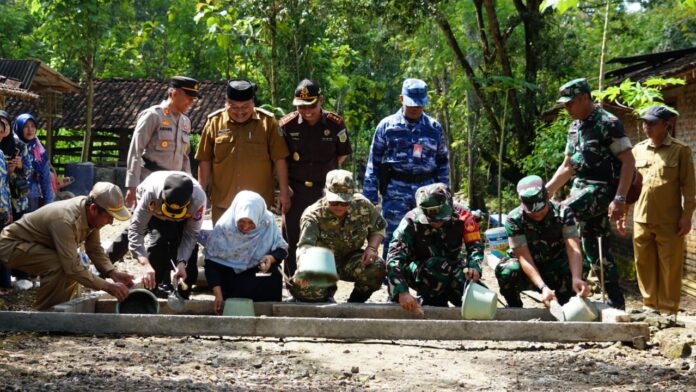 “Pokoke masyarakat kudu gotong royong bareng TNI mbangun deso.” Ucap Bupati saat menyapa masyarakat sebelum melakukan simbolis peletakan batu pertama.