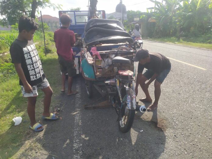Sesampainya di tempat kejadian perkara, dari arah Timur hendak menyebrang ke arah Utara melaju Becak Motor yang dikendarai pria berinisial WO (62) warga Padukuhan Biro, Seloharjo, Pundong, Bantul, sehingga terjadi tabrakan.