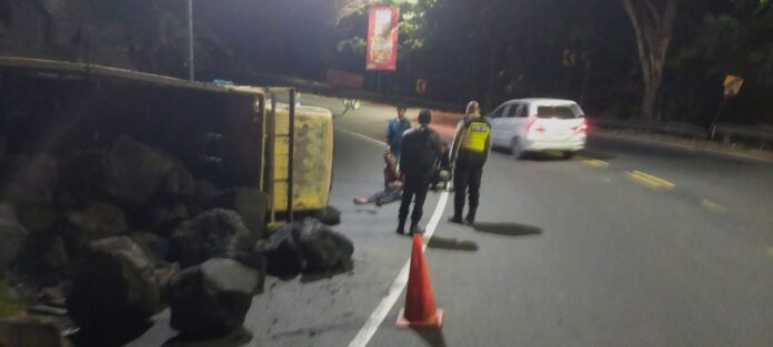 GUNUNGKIDUL, DIY (FAKTA9.COM)_ _// Truk nomor polisi AA 1785 EK bermuatan batu terguling di Tanjakan Tikungan Slumprit, Patuk, Patuk, Gunungkidul, Minggu (03/08/2025) sekitar 01.00 WIB.