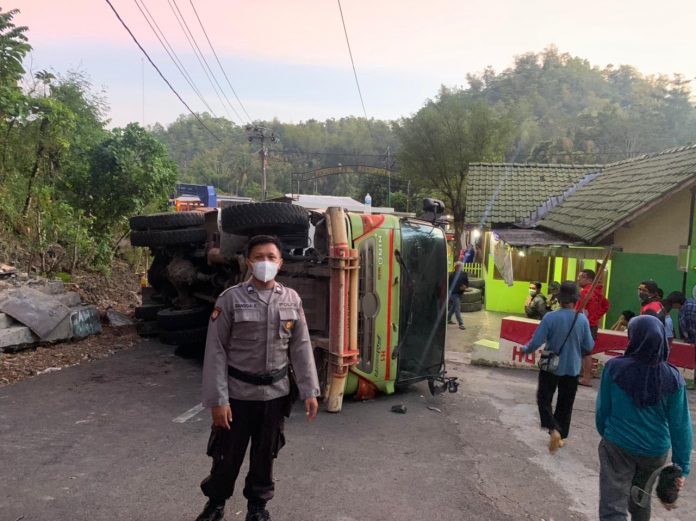 TEPUS, (Fakta9.com)_//Truk tronton dump nopol B 9224 NYT terguling saat melintas di tanjakan Dloko, Padukuhan Dloko, Kalurahan Tepus, Kapanewon Tepus pada Kamis, (29/04/2021) sekitar pukul 03.05 WIB.
