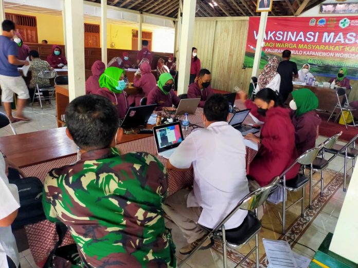 WONOSARI ( fakta9.com ) _ _// Untuk mendongkrak pencapaian kebutuhan vaksin kepada warga masyarkat, pemerintah Kalurahan Mulo bekerjasama dengan Dinas Kesehatan Kabupaten Gunungkidul, Puskesmas Wonosari 1, Sambatan Jogja ( Sonjo DIY ), Kodim 0730/GK dan relawan Kalurahan Mulo melaksanakan vaksinasi massal yang bertempat di balai Kalurahan Mulo Pada Hari Rabu 03 November 2021.