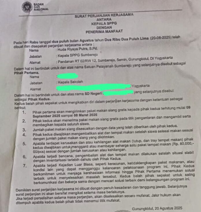 GUNUNGKIDUL, (FAKTA9.COM)__//Foto perjanjian yang meminta penerima manfaat Makan Bergizi Gratis (MBG) merahasiakan informasi jika terjadi keracunan menjadi perbincangan di kalangan masyarakat.