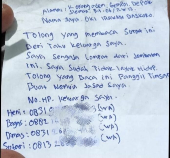 Saya sengaja lompat dari jembatan ini. Saya sudah tidak layak hidup. Tolong yang baca ini panggil tim sar buat nemuin jasad saya.