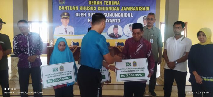 Ponjong (Fakta9.com)_ _// Bantuan Khusus Keuangan (BKK) Jabanisasi diserahkan kepada 110 warga yang bertempat tinggal di Kalurahan Sawahan, Kalurahan Umbulrejo, dan Kalurahan Genjahan Kapanewon Ponjong.