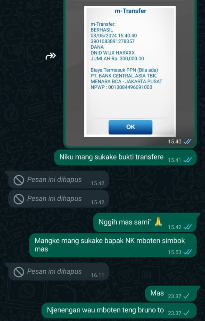 Diceritakan oleh Handono bahwa bahwa peristiwa itu bermula pada hari Jum’ at (3/05/2024) sekitar pukul 15.15 WIB kemarin. Tiba-tiba ia mendapat pesan singkat dari nomor baru melalui media sosial Whatshaap.